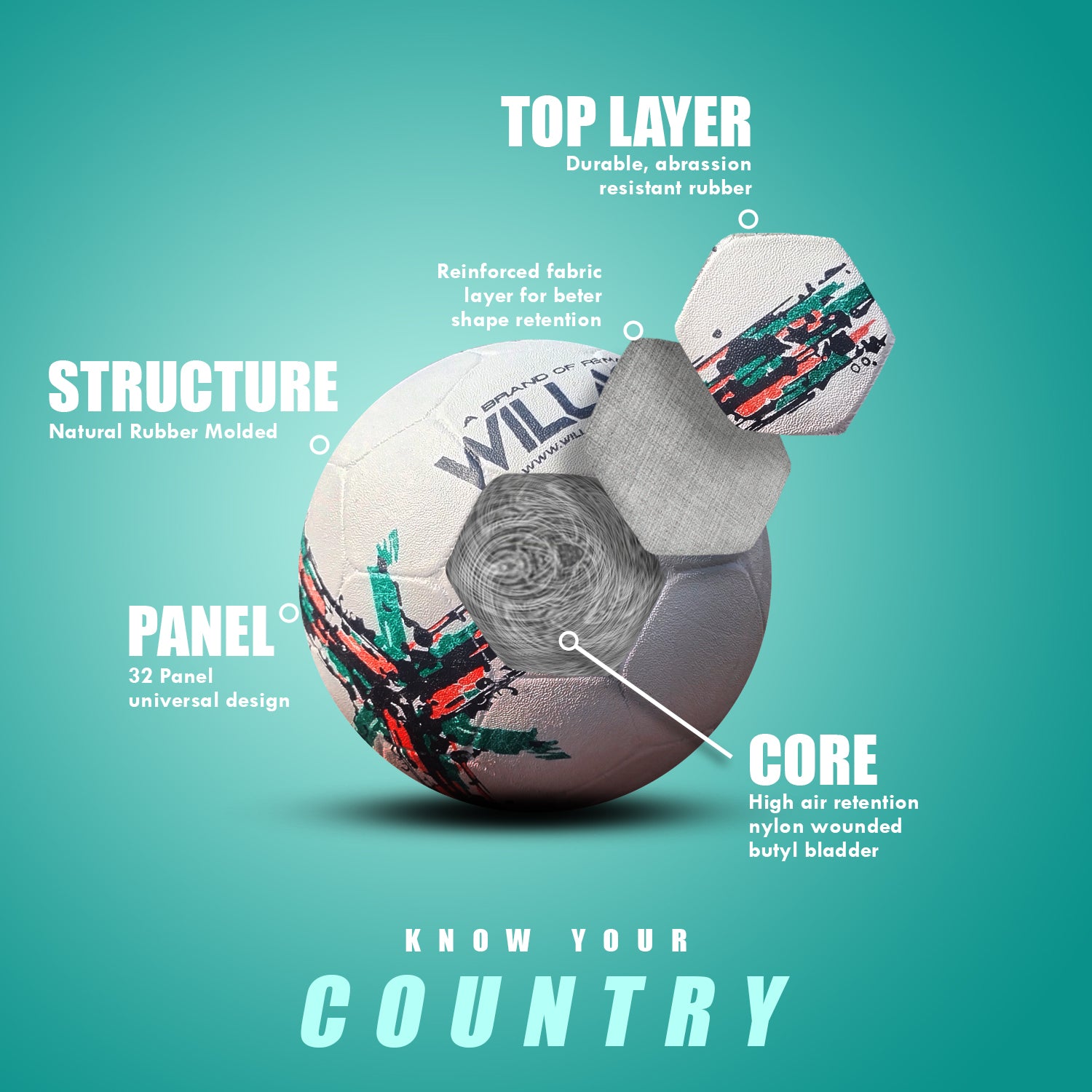 \\nIntroducing the "Country" football, a revolutionary sports accessory designed to dominate the toughest terrains with its exceptional durability and performance. Crafted with utmost precision, this rubber molded football is a force to be reckoned with. \\nHigh Bounce Latex Core